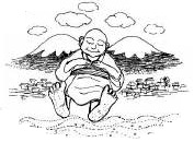 大太法師は、二十一日間も眠りつづけ、ようやく目を覚ましたのですが、そのとき、大勢の村人が足元で何かを相談していました。村人がどんな相談をしていたのか、大太法師には聞こえませんでしたが、やがて村人たちには、長い梯子(はしご)を持ってきますと、大きな足の裏に立てかけ、いっぱい付いている砂を落とし始めたのです。大太法師は、足裏がくすぐったくなって大笑いしながら、むっくり起き上がりました。
