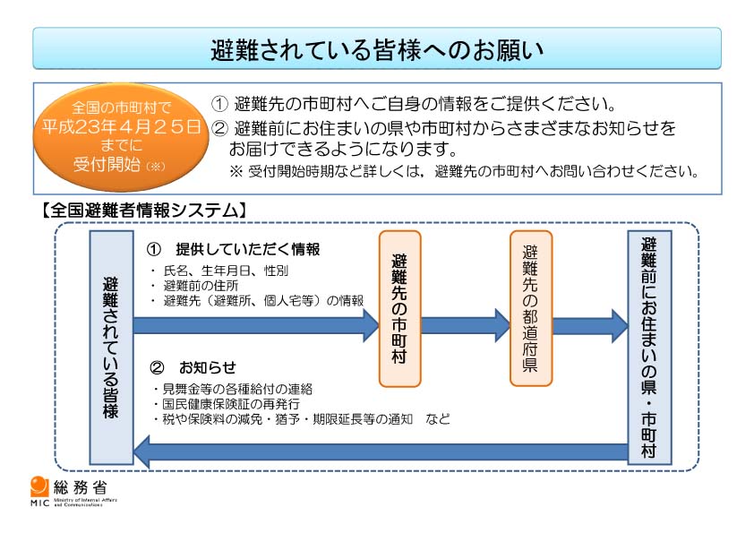 住所地(避難される前にお住まい)の県市町村から、各種通知や支援情報を提供するため、「全国避難者情報システム」が構築されることになりましたので、避難先の所在地等の情報を市役所までご連絡ください。