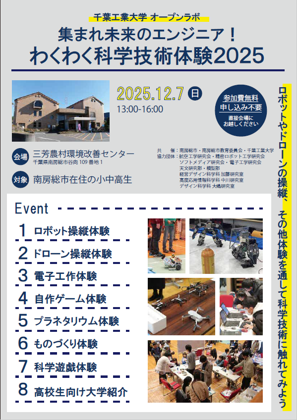12月7日(日)、南房総市三芳農村環境改善センターにて、当市在住の小中高生を対象に千葉工業大学と共催で「集まれ未来のエンジニア!わくわく科学技術体験2025」を開催します。