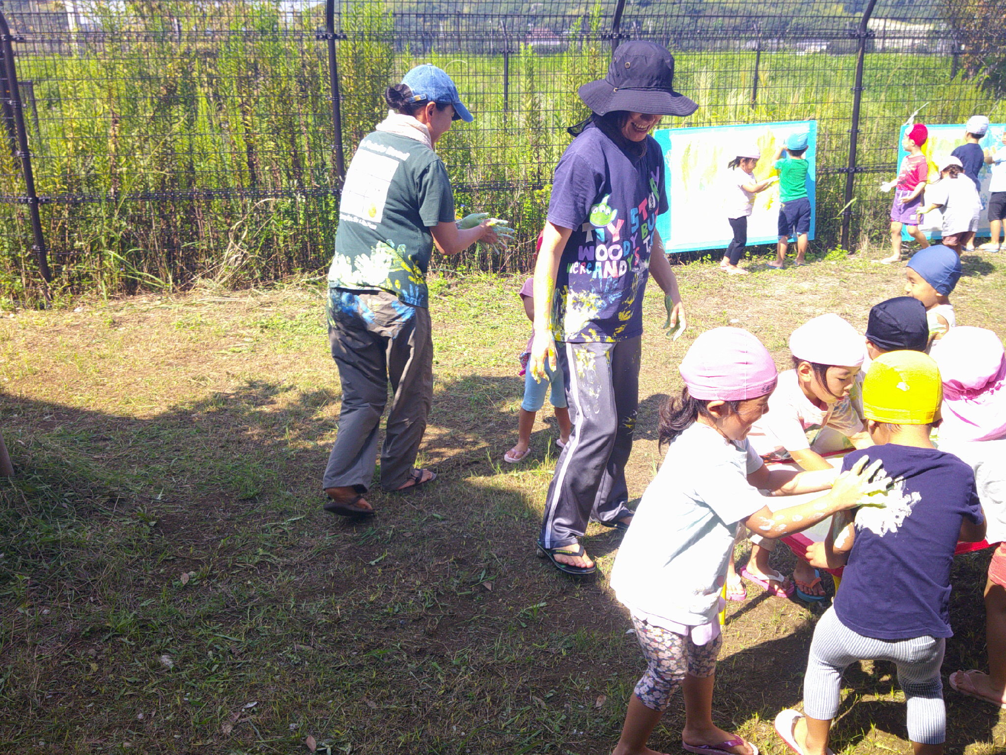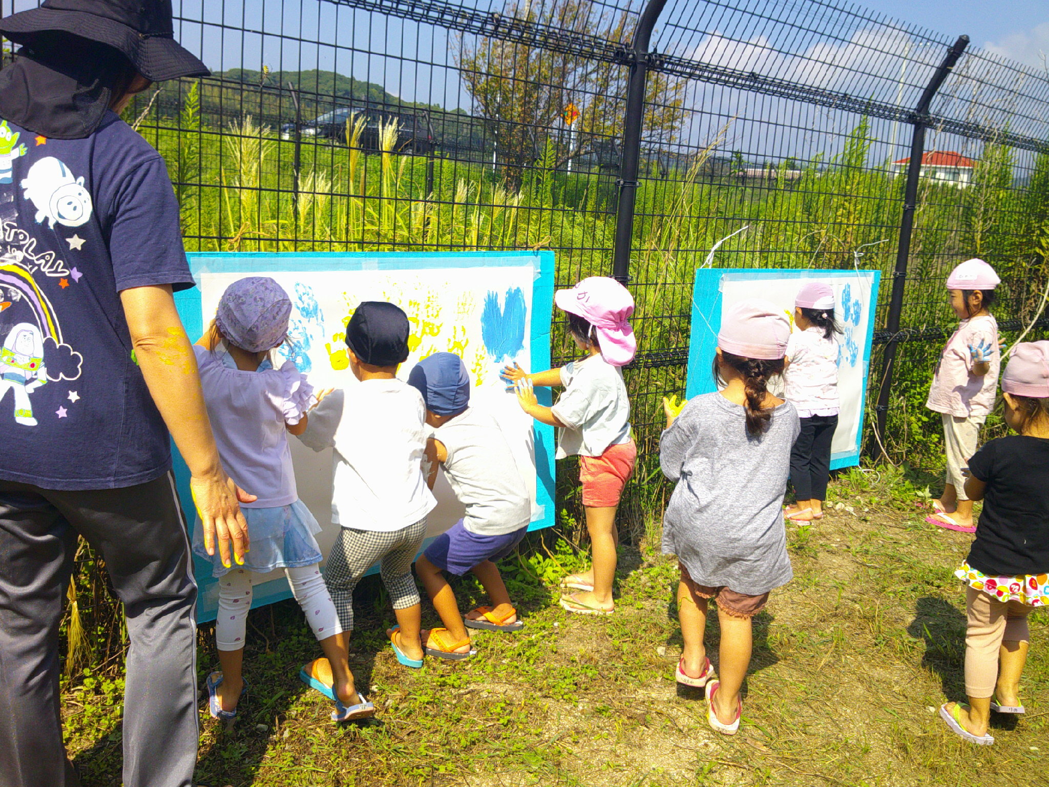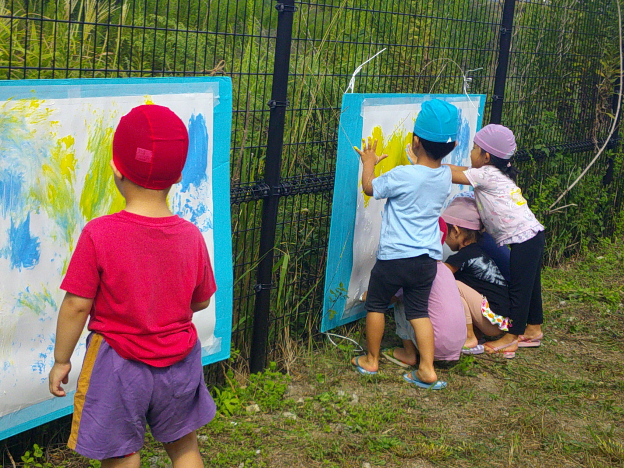 フェンスに張り付けられたキャンバスに