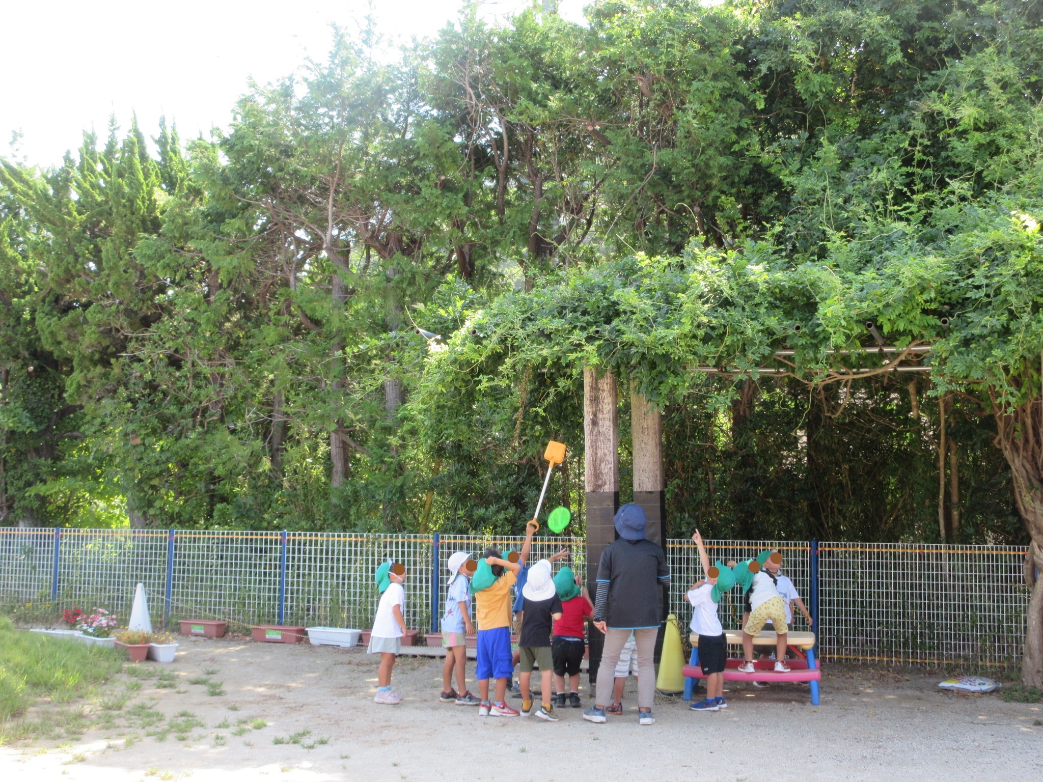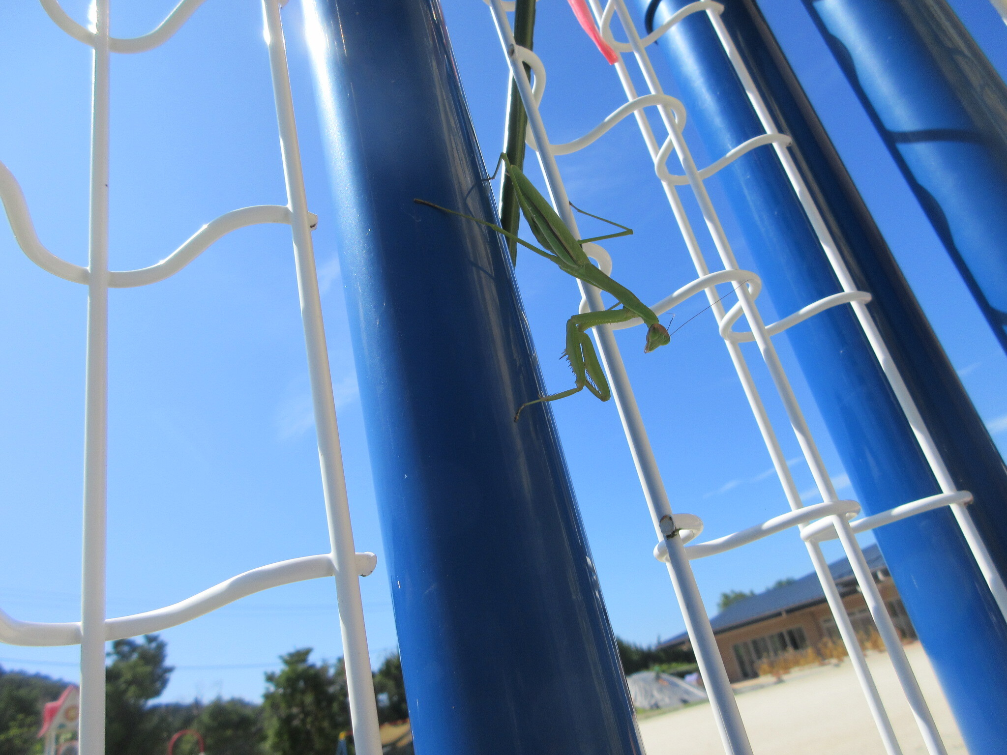 プールを楽しむぞう組さんの近くにも、かまきりがいました。