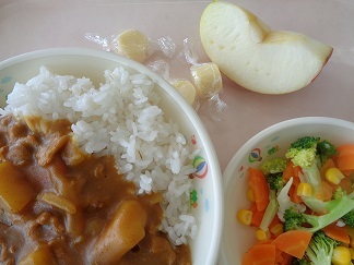 チキンカレーライスチーズで鉄分花野菜のサラダりんごおやつは、元気ヨーグルトカルシウムウエハース