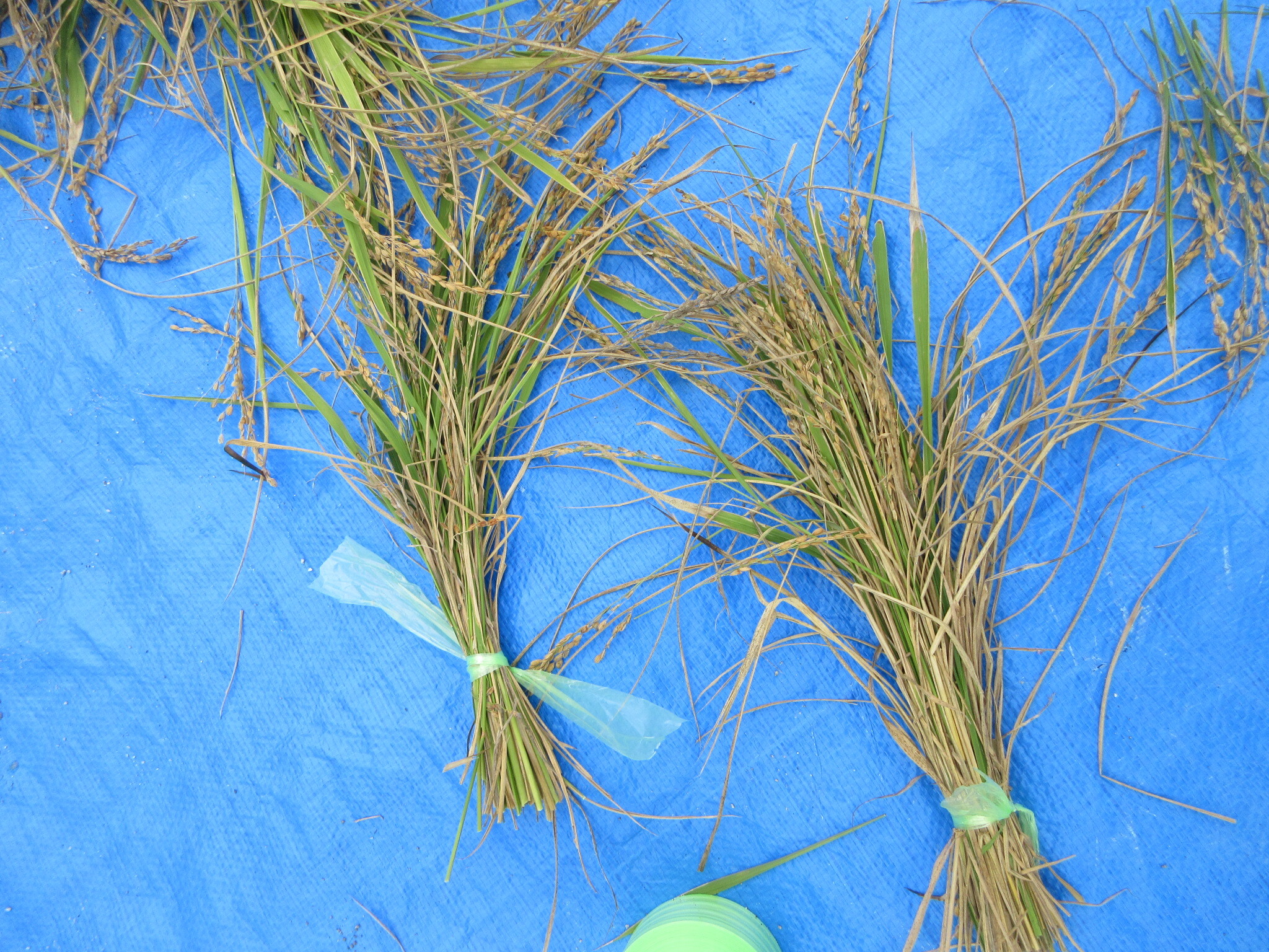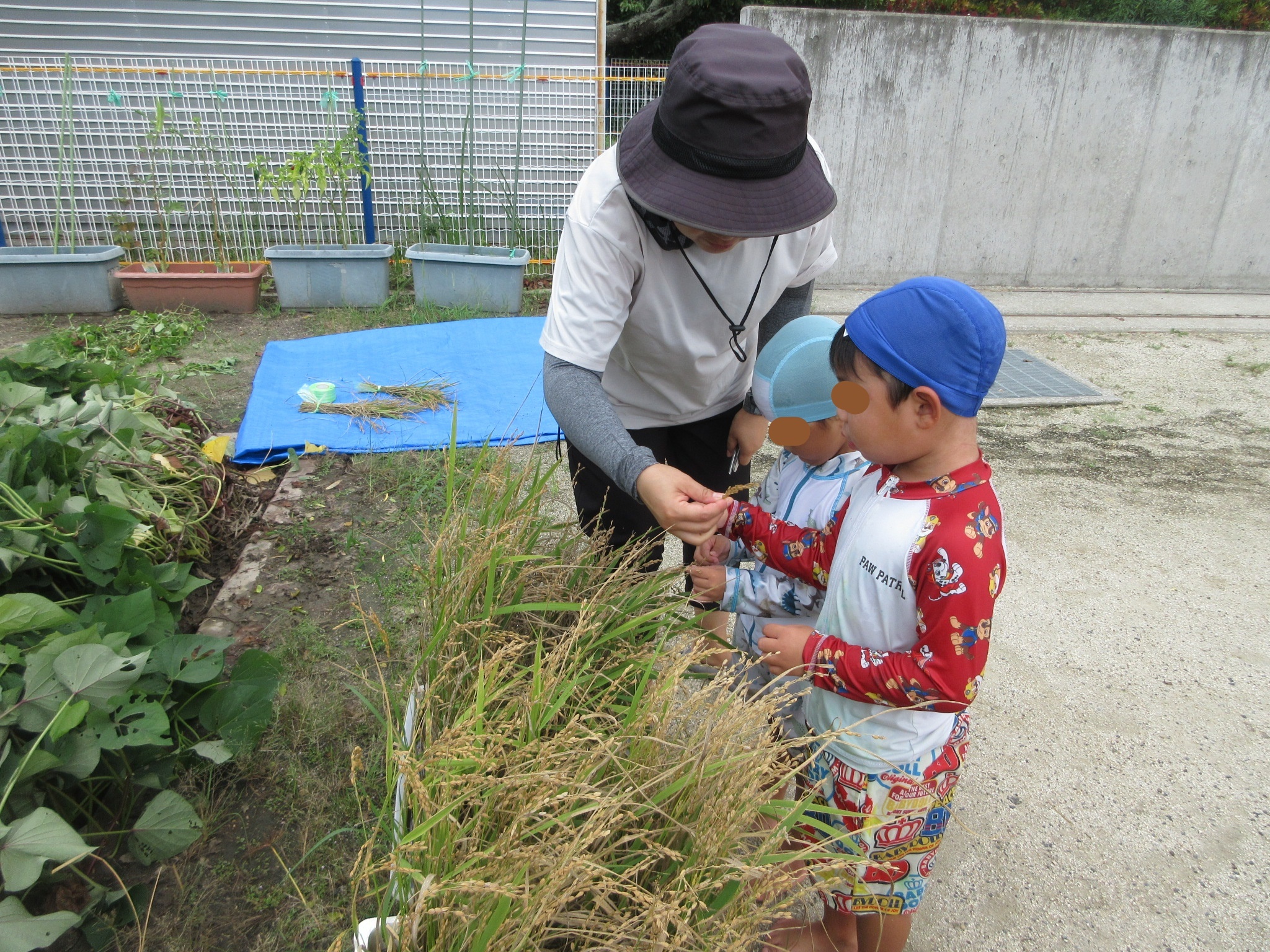 ぱんだ組さんとうさぎ組さんが、稲刈りをしていました。