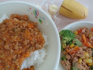 ドライカレーチーズで鉄分ブロッコリーのサラダバナナおやつは、オレンジゼリー塩せんべい
