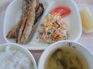 ご飯みそ汁(じゃが芋、玉ねぎ、わかめ)さんまのかば焼きトマトコールスローサラダグレープフルーツ