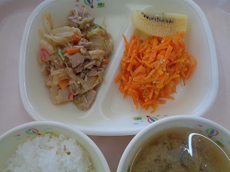 ご飯みそ汁(なす、油揚げ、玉ねぎ)すき焼き風煮物人参しりしりキウイフルーツ