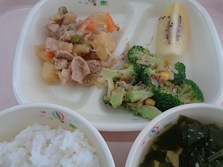 ご飯すまし汁(豆腐、ほうれん草)味噌肉じゃがブロッコリーのおかか和えキウイフルーツ