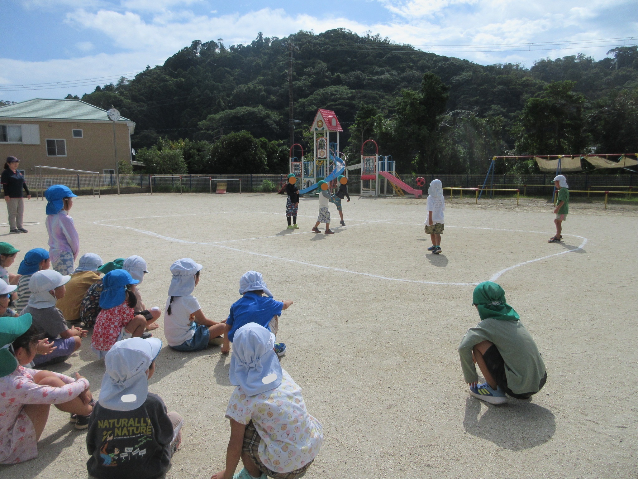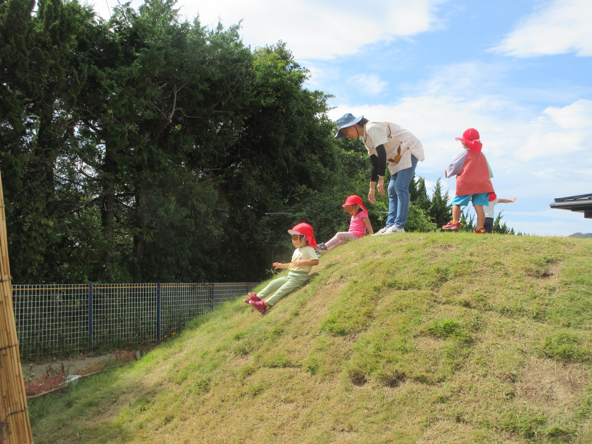園庭で、友達や先生と会話を楽しみながら遊んでいます。