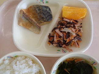 ご飯すまし汁(そうめん、ほうれん草、椎茸、人参)鯖の味噌煮ひじきサラダオレンジ