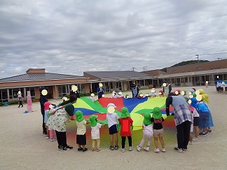 幼稚園の体験入園です。園庭で元気いっぱいに遊びましょう!うさぎ組のお友達もバルーンに参加していますね。