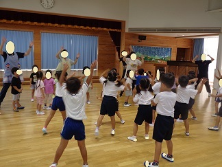 場所は遊戯室に変わり・・今度はみんなで体操です。
