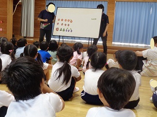 パネルシアターも見ました。「はらぺこあおむし」ですね。3歳のお友達が入園してくるのを楽しみに待っています。