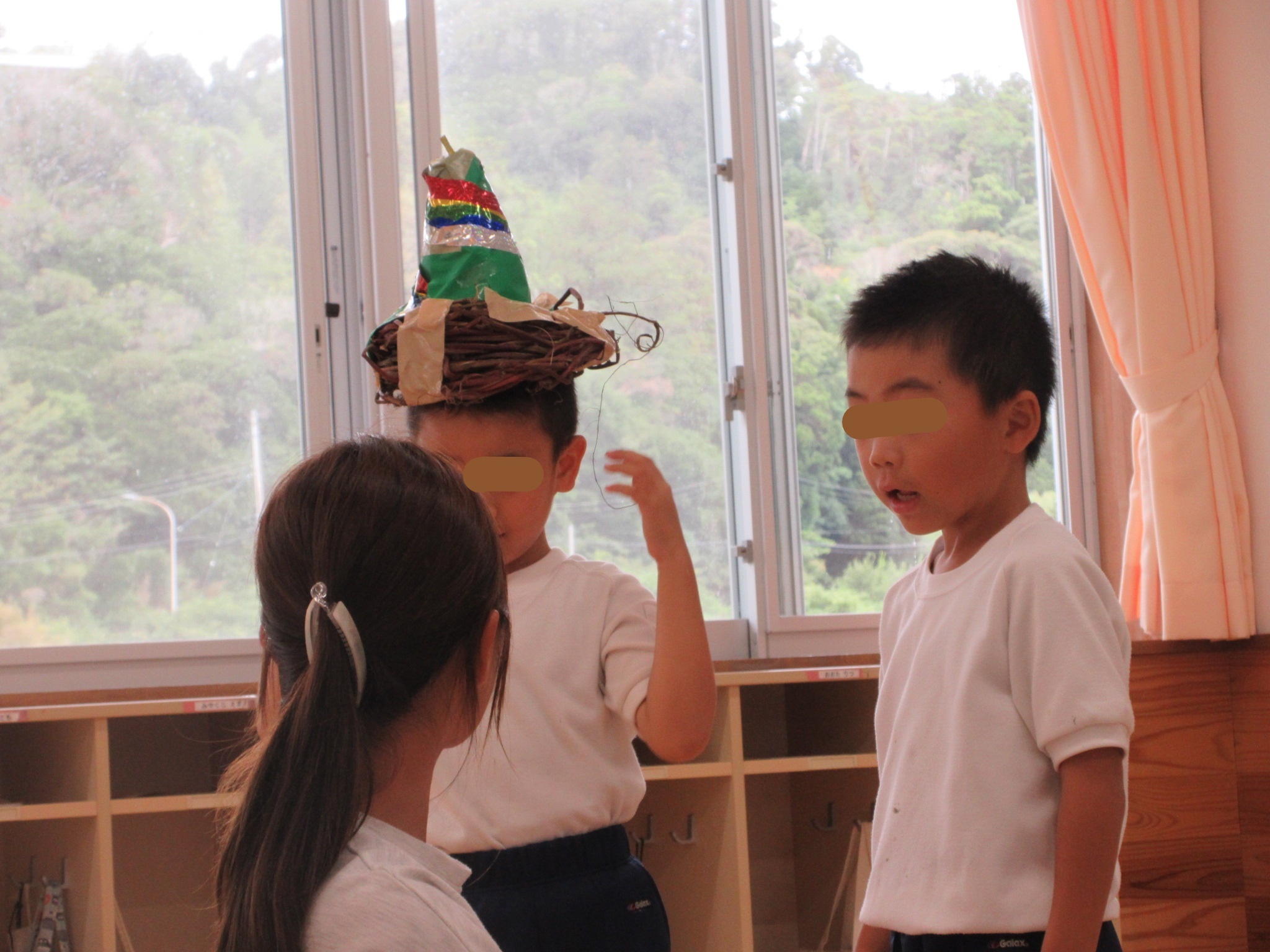 年長さんに教わって作ったマントをつけて走り去るお友達もいました。