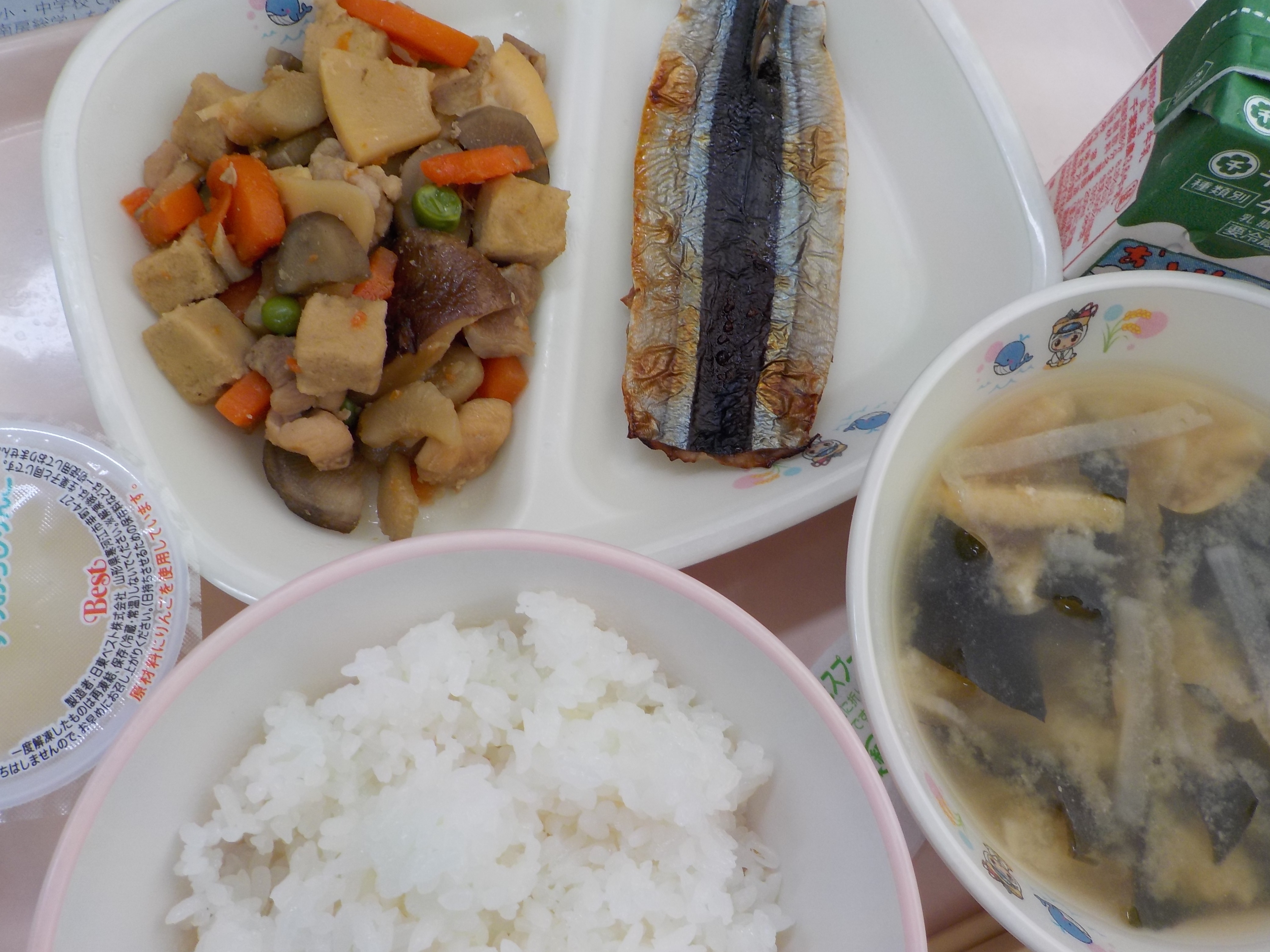 ごはん さんまの一夜干し 含め煮 大根と油揚げの味噌汁 りんごのミニデザート 牛乳
