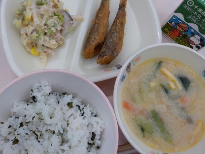 わかめごはん めひかり唐揚げ 和風マカロニサラダ 豆乳仕立ての沢煮椀 牛乳