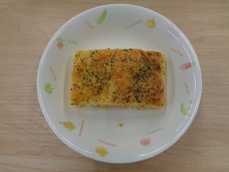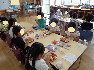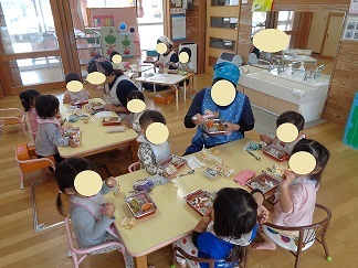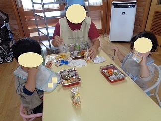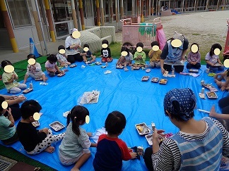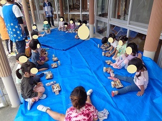 うさぎ組のお友達はお部屋の前にシートを広げました。外で食べるのもいいですね。