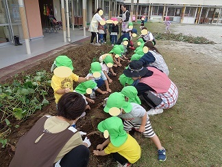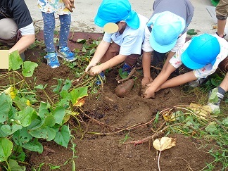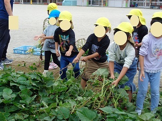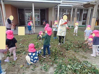 ぱんだ組は芋ほりの後、つるで引っ張りっこをしたりリースを作ったりしました。