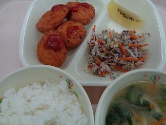 ご飯みそ汁(油揚げ、小松菜、人参、切干)おからナゲットキャベツのゆかり和えキウイフルーツ
