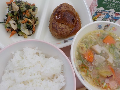 ごはん おろしハンバーグ 礒香和え 根菜汁 牛乳