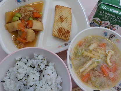 わかめごはん イカのにんにくバター醤油焼き 里芋のそぼろ煮 豆乳仕立ての味噌汁 牛乳