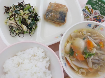 ごはん 鯖の味噌煮 うま塩昆布和え 法度汁 牛乳