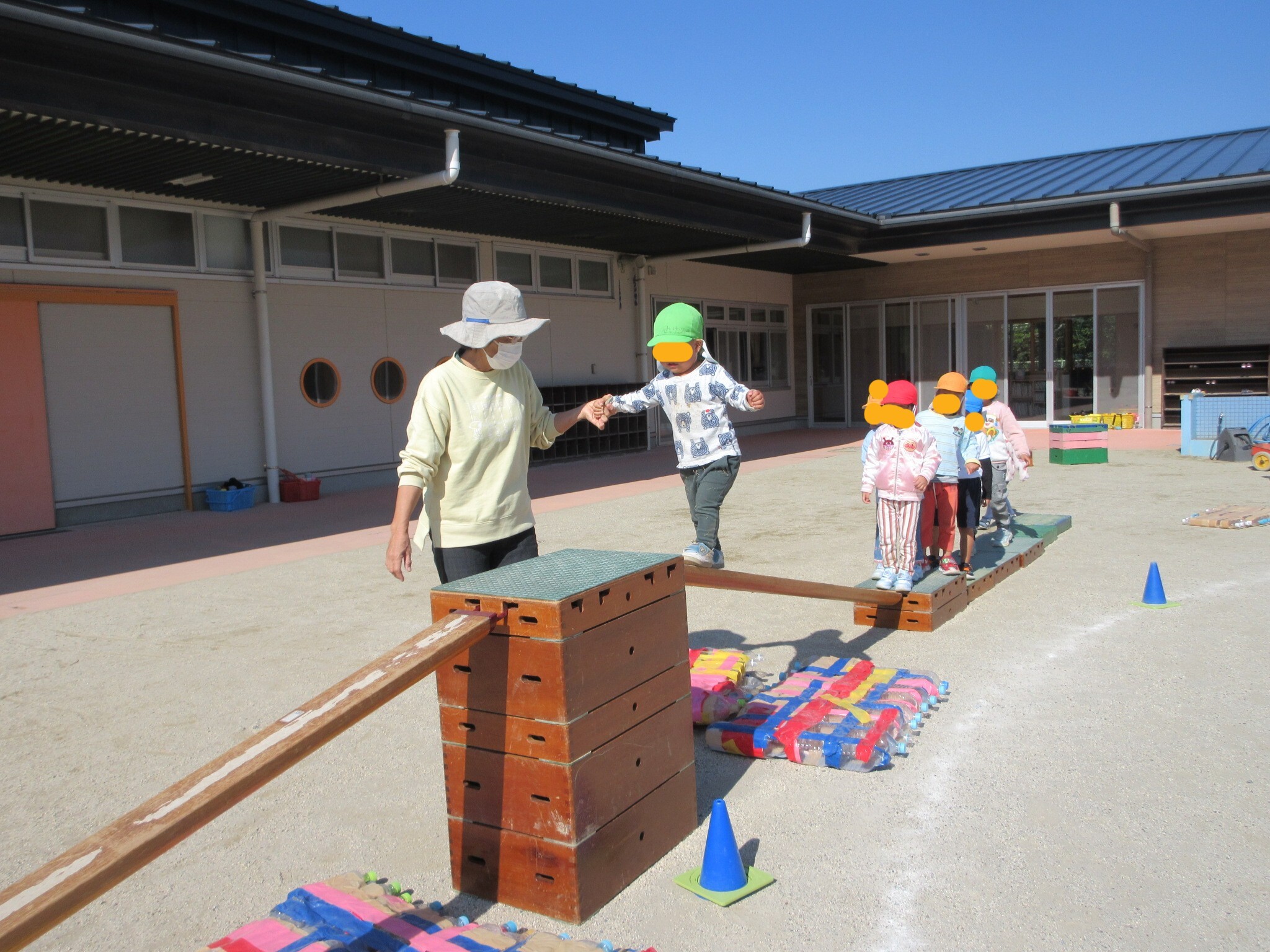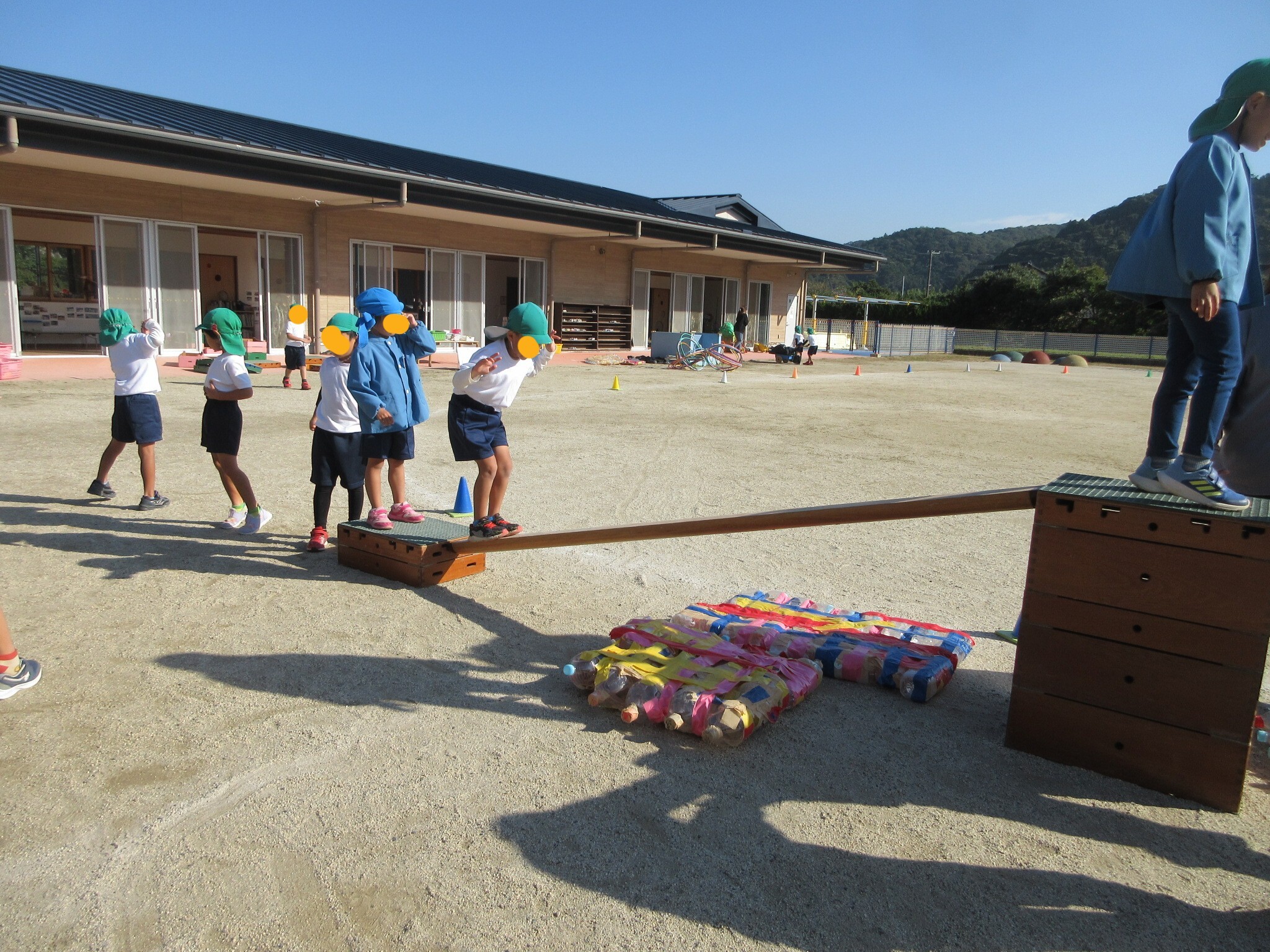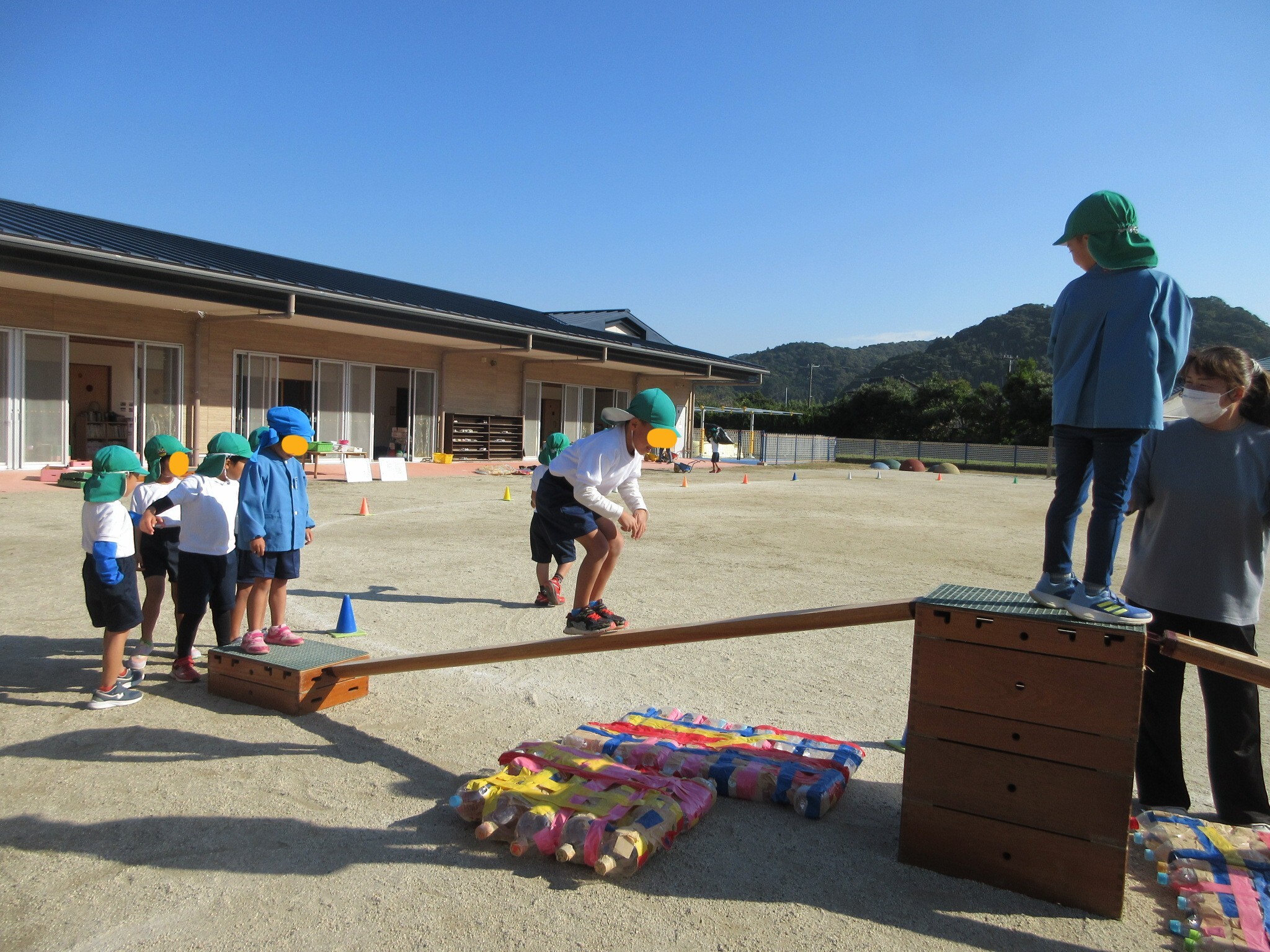 幼稚園の子どもたちが準備している巧技台が、高くなっています。