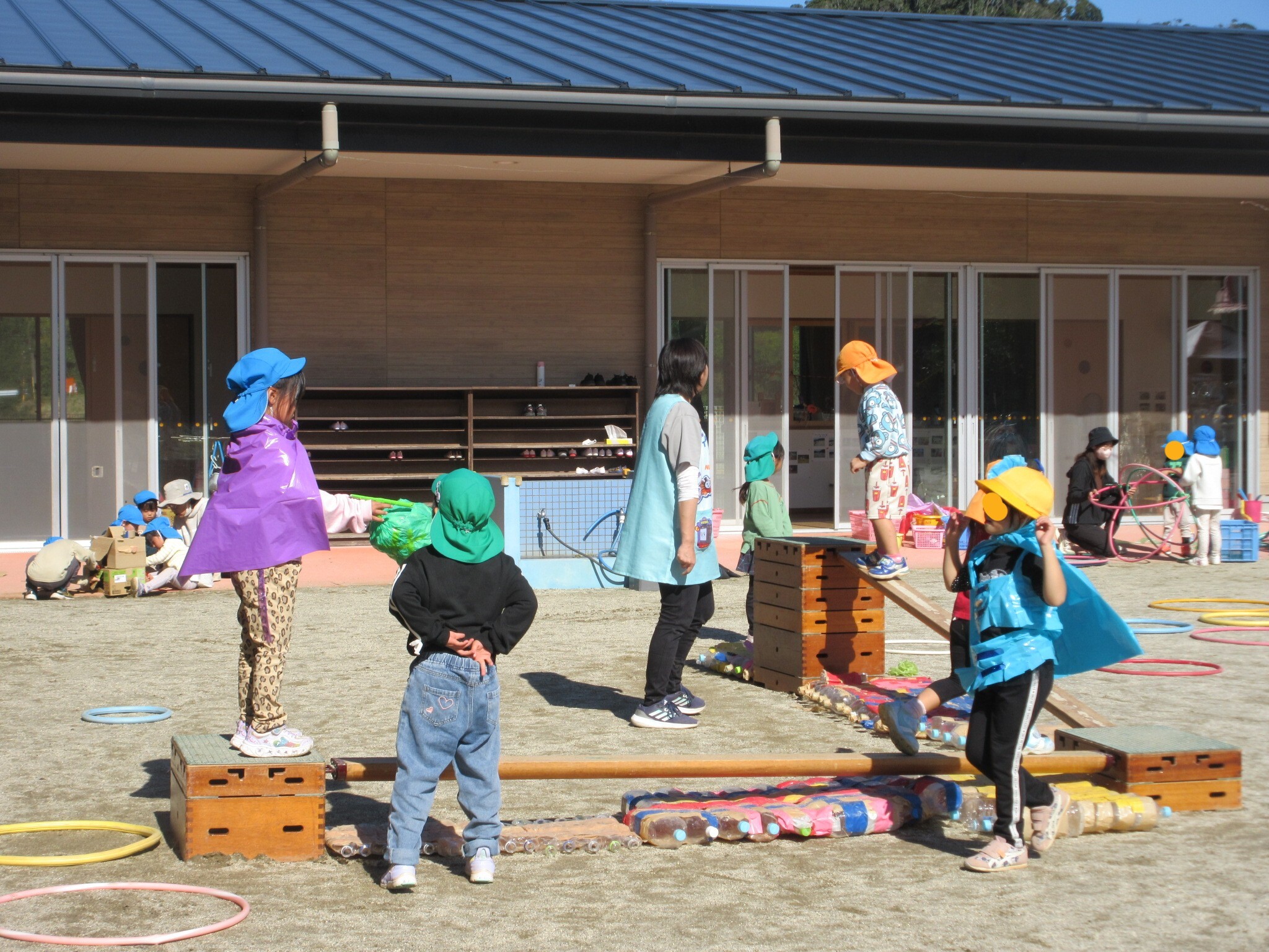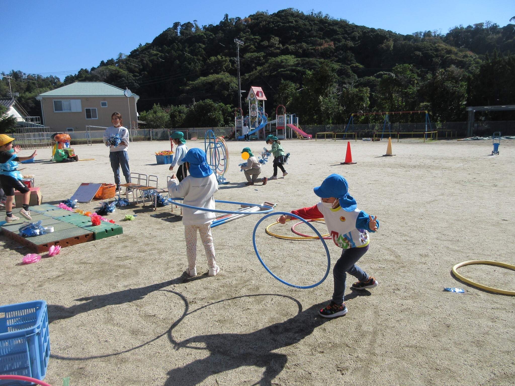 フラフープ遊びでは、手や腰、本数をかえて等、