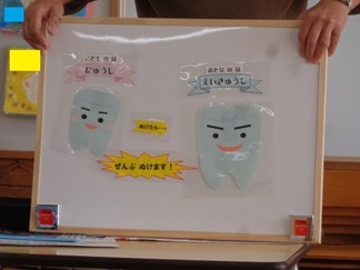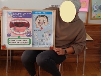 幼稚園のお友達も大切な歯が虫歯にならないようにじっとお話を聞いていました。特に乳歯から永久歯に生え変わることに興味津々な様子です。