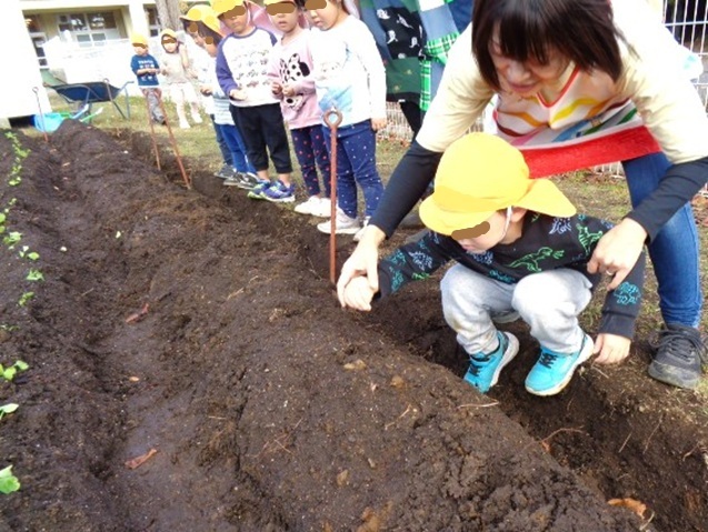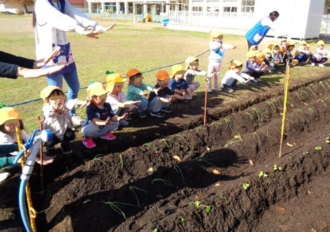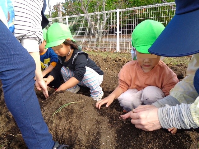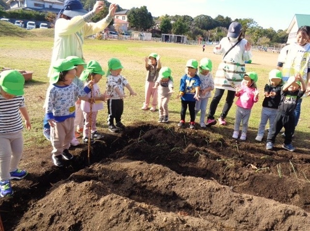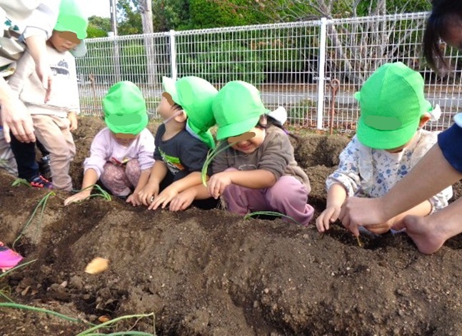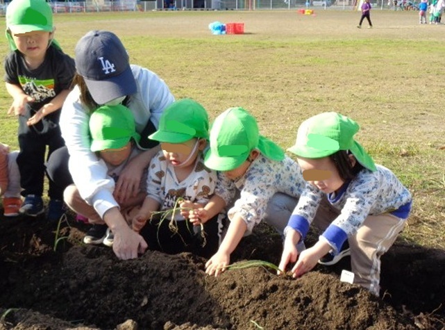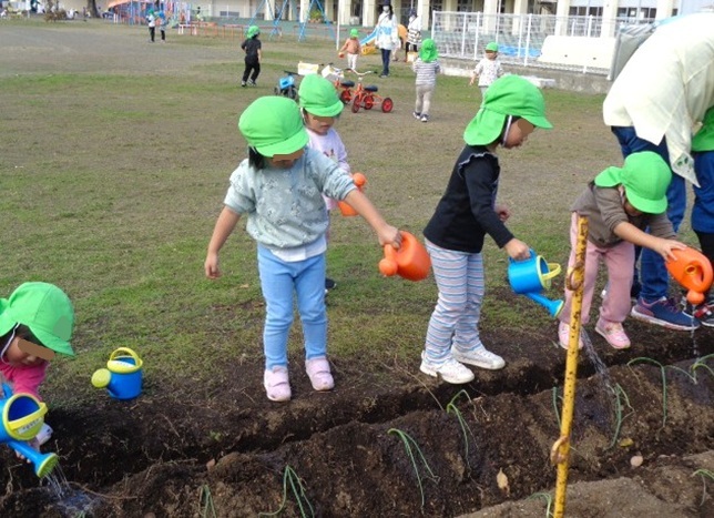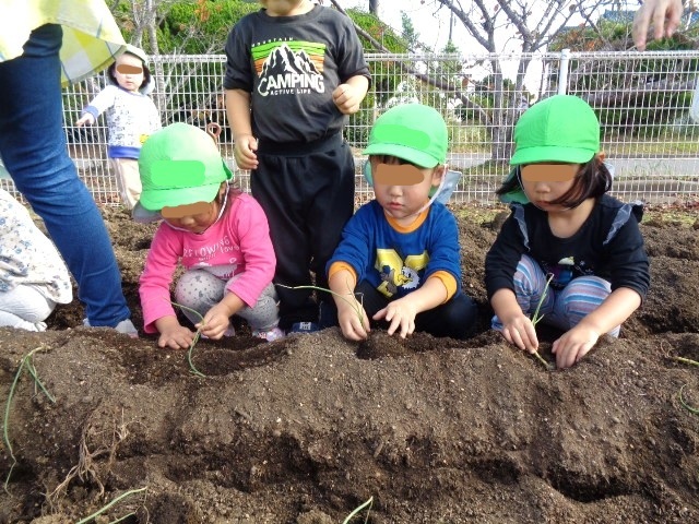保育所の2歳さんが玉ねぎの苗を