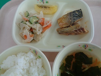 ご飯すまし汁(そうめん、小松菜、人参)鯖の味噌煮れんこんのシャキシャキサラダキウイフルーツ