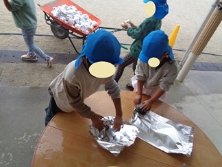 ばばばあちゃんの絵本を見て焼き芋がしたい!みんなで食べたい!ということで焼き芋の準備が始まりました。