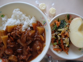 ハヤシライス ※園でとれたさつま芋入りチーズで鉄分白菜の塩昆布和えりんご