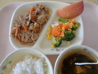 ご飯すまし汁(豆腐、三つ葉、椎茸)豚肉のしょうが焼き花野菜のサラダりんごおやつは、オレンジゼリー塩せんべい