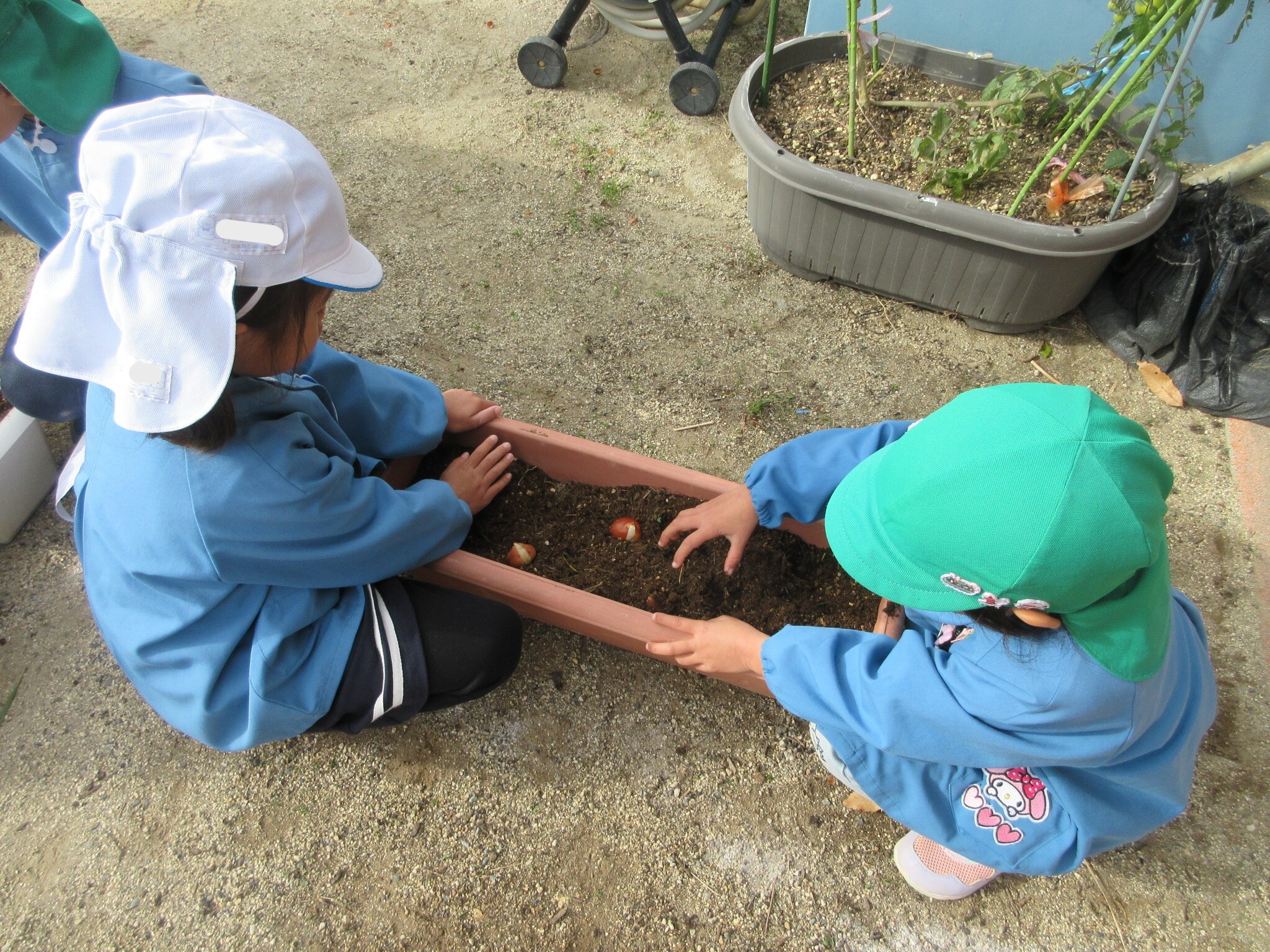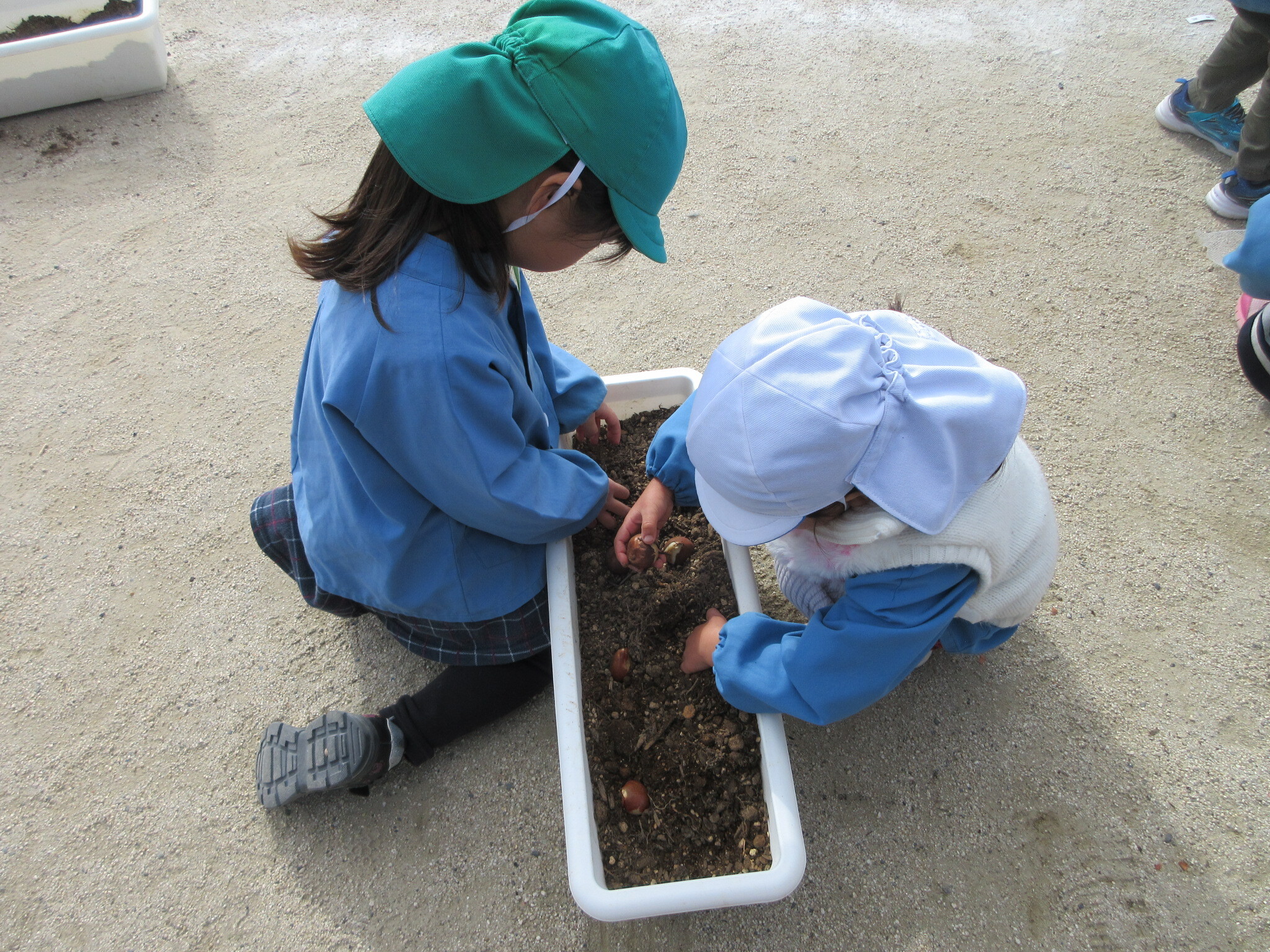 幼稚園では、チューリップの球根の植えつけが行われました。