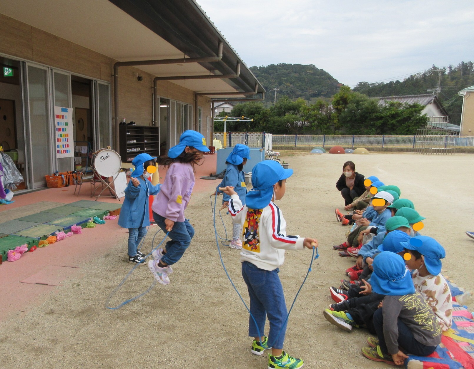 【短縄の前とび、回してピョン】【長縄のおたんじょうび】が流行っています。