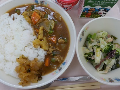ごはん 冬野菜カレー 海の幸のサラダ 福神漬 ヨーグルト 牛乳