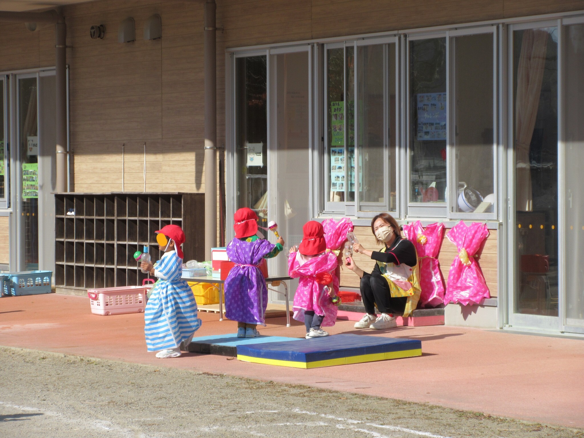 かわいい衣装とマイクを手にした子どもたちがいます。