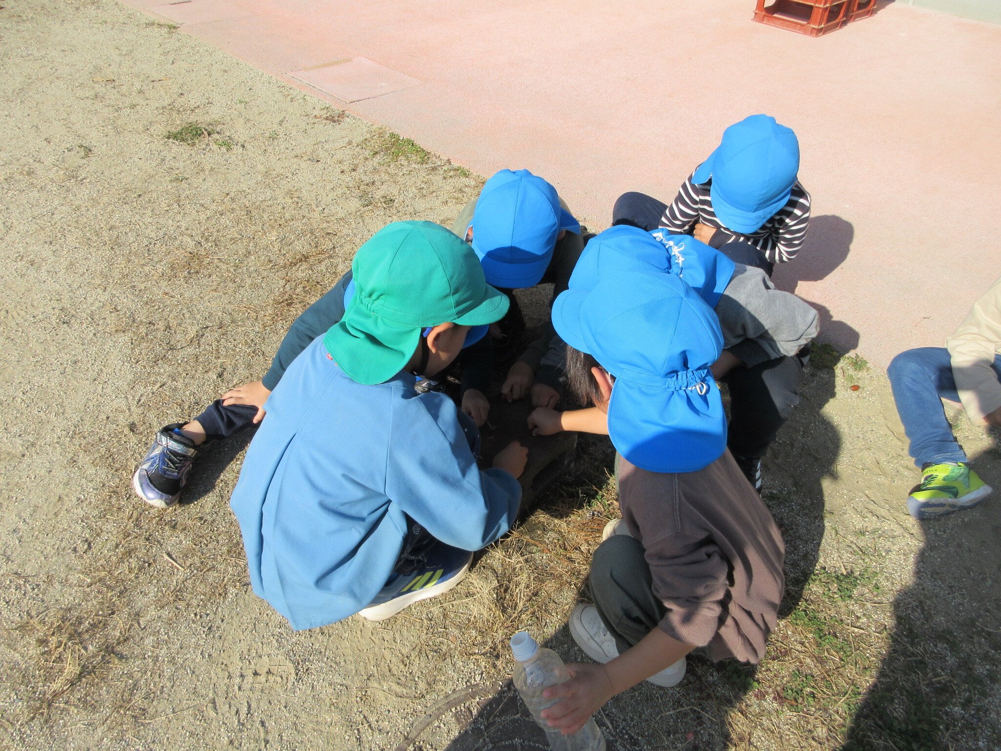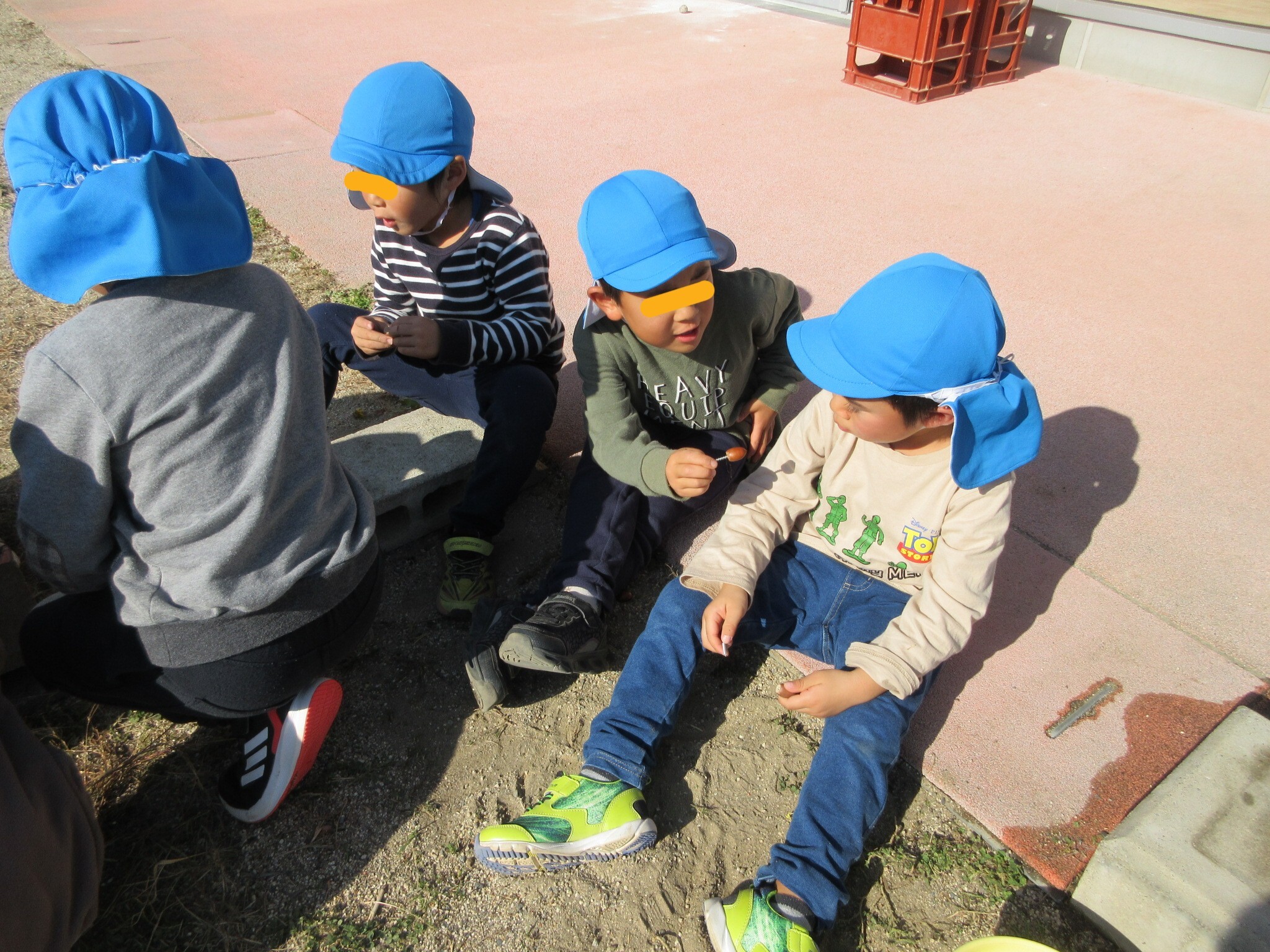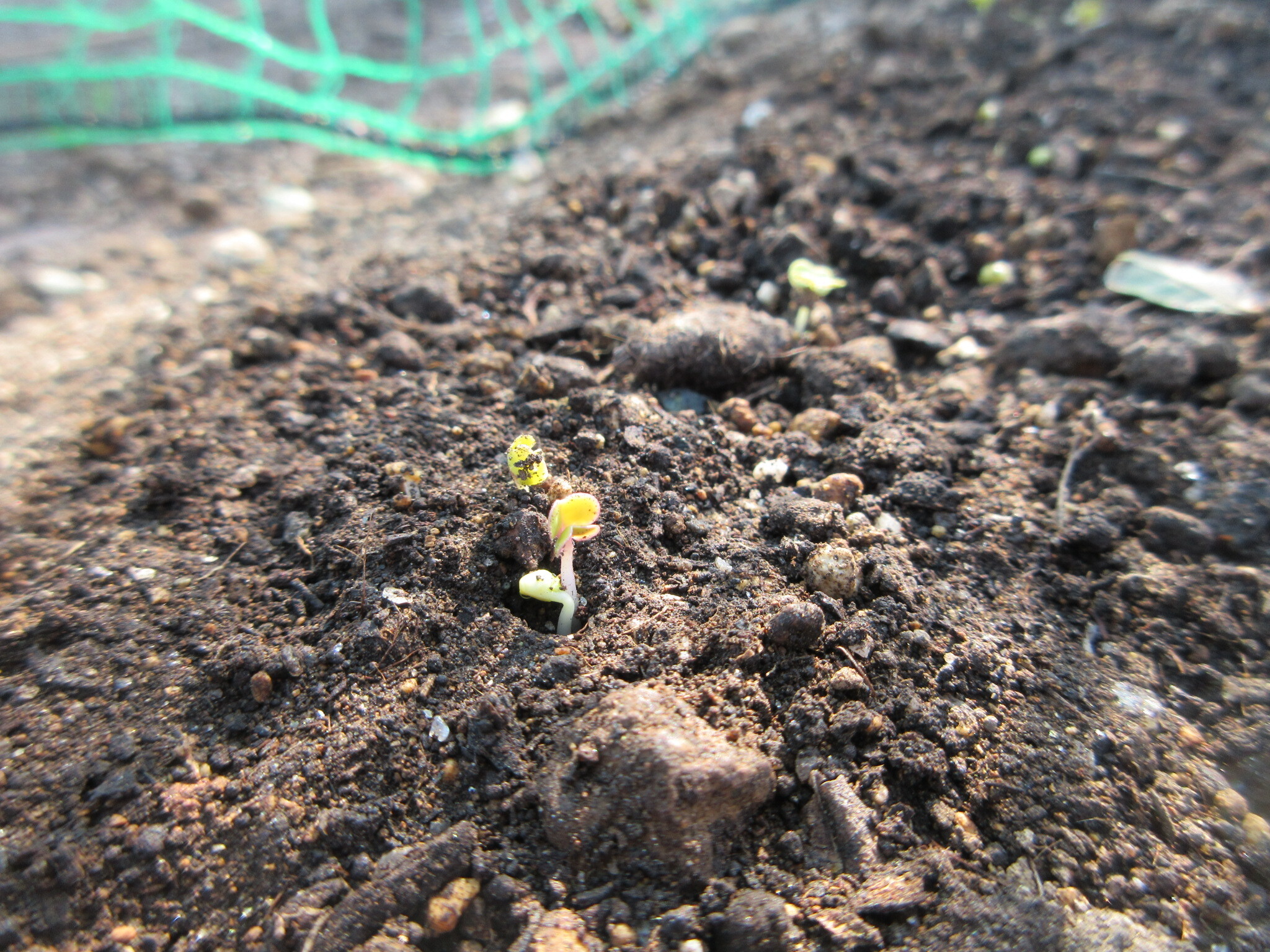 小さな芽ですが、水やりに来たお友達も気づいたようです。
