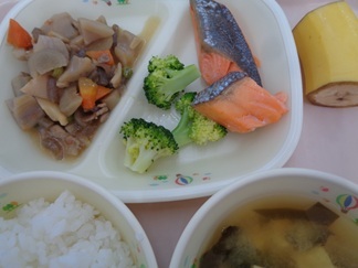 ご飯みそ汁(豆腐、たまねぎ、わかめ)鮭の塩焼きブロッコリー筑前煮バナナ