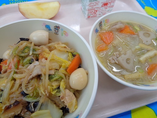 野菜あんかけ丼 豆乳仕立てのみそ汁 牛乳 りんご