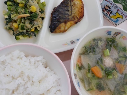ごはん 鯖のカレー玉漬け 青菜のナッツ和え 鶏つみれ汁 牛乳