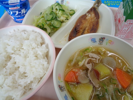 ごはん イワシの蒲焼き 焼肉屋のサラダ さつま汁 牛乳 ヨーグルト