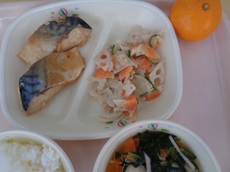ご飯すまし汁(ほうれん草、麩、かまぼこ、人参)鯖の味噌煮れんこんのシャキシャキサラダみかん