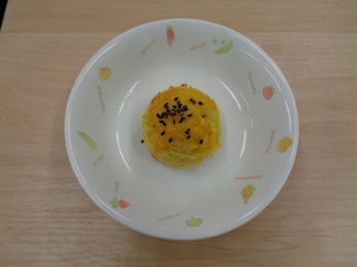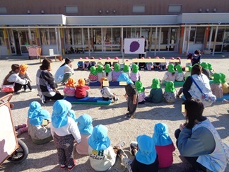 ぱんだ組のお友達がくだもの いろいろ かくれんぼのお話をしてくれました。小さなお友達がじっと聞いています。
