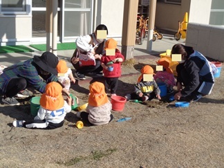 ひよこ組のお友達は砂遊びをしています。少しずつですが、シャベルで砂をすくうようになってきました。