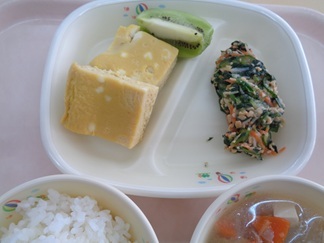 ご飯豚汁厚焼き卵ほうれん草の納豆しらす和えキウイフルーツ