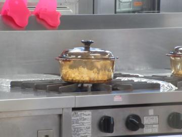 お鍋の中で弾けるポップコーンを見つめます。