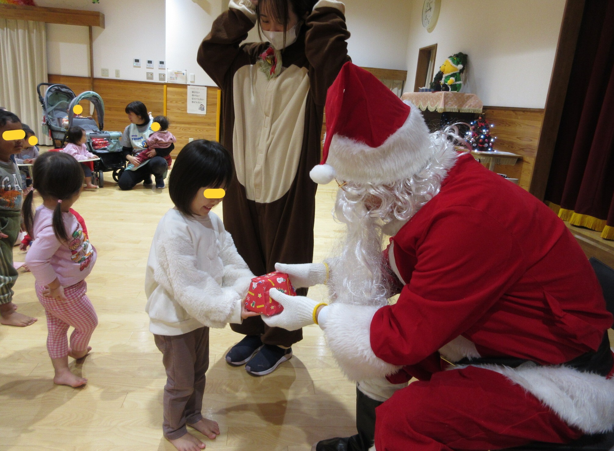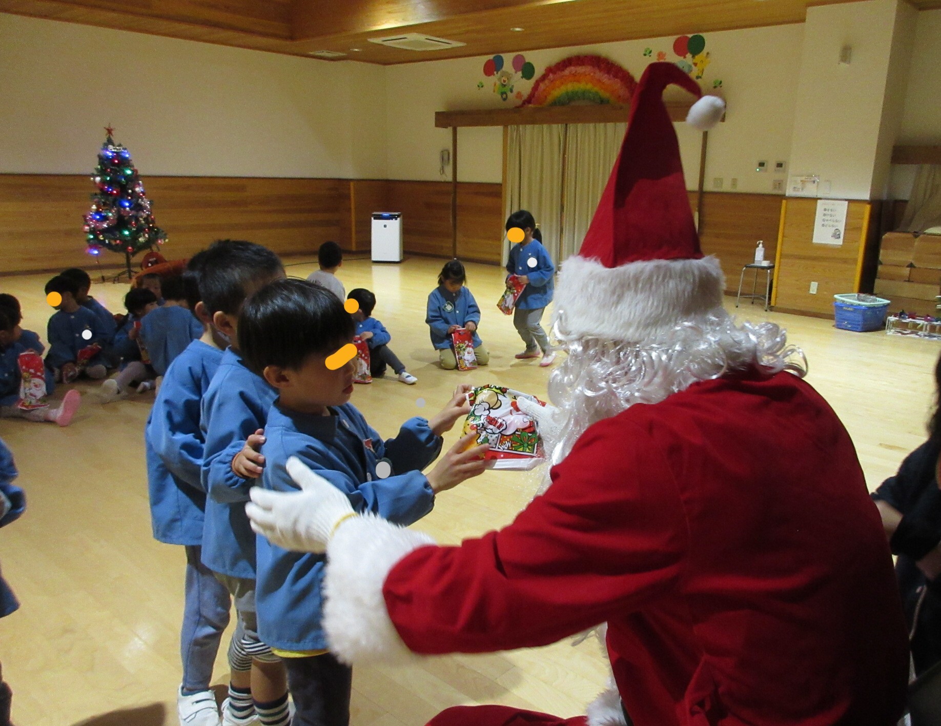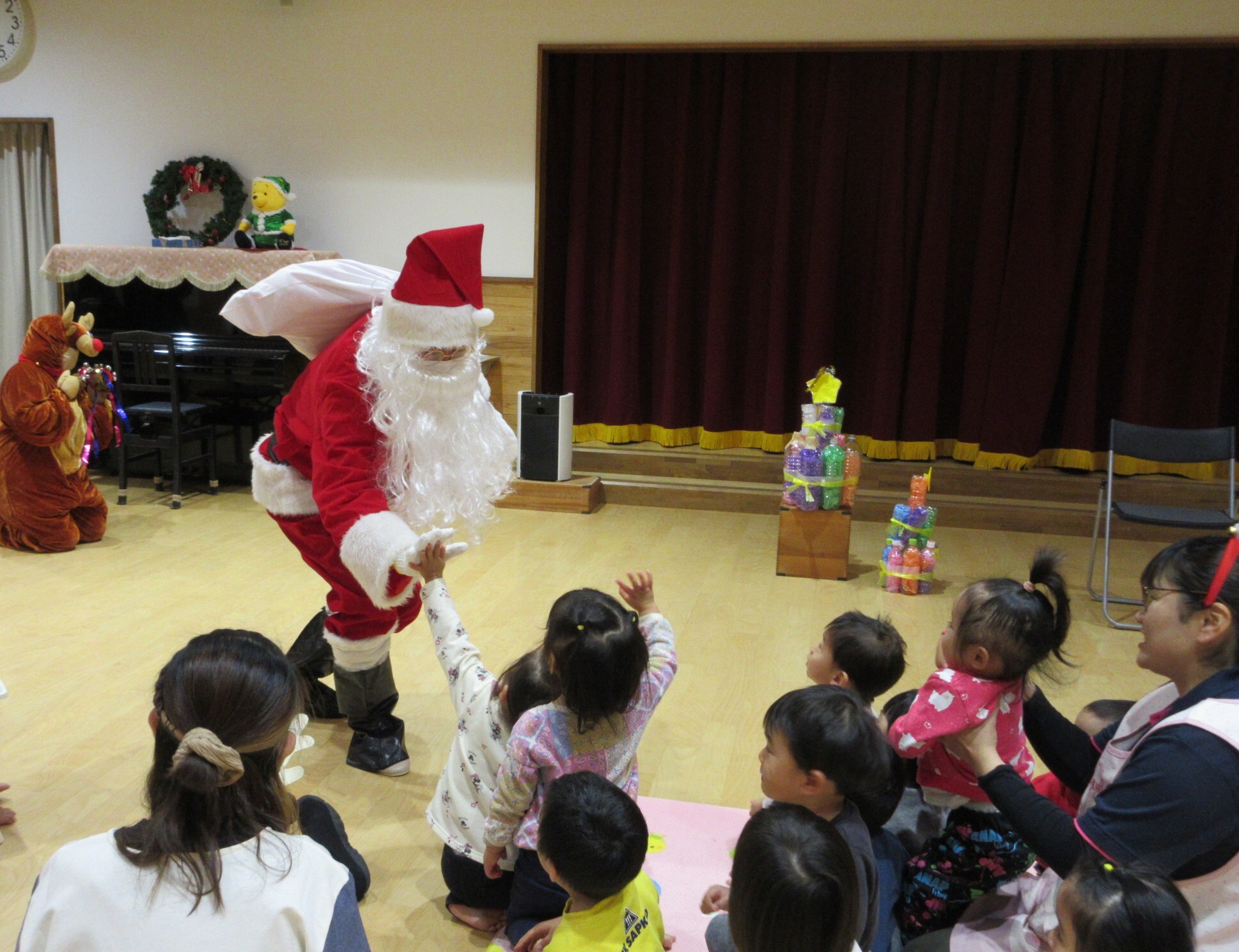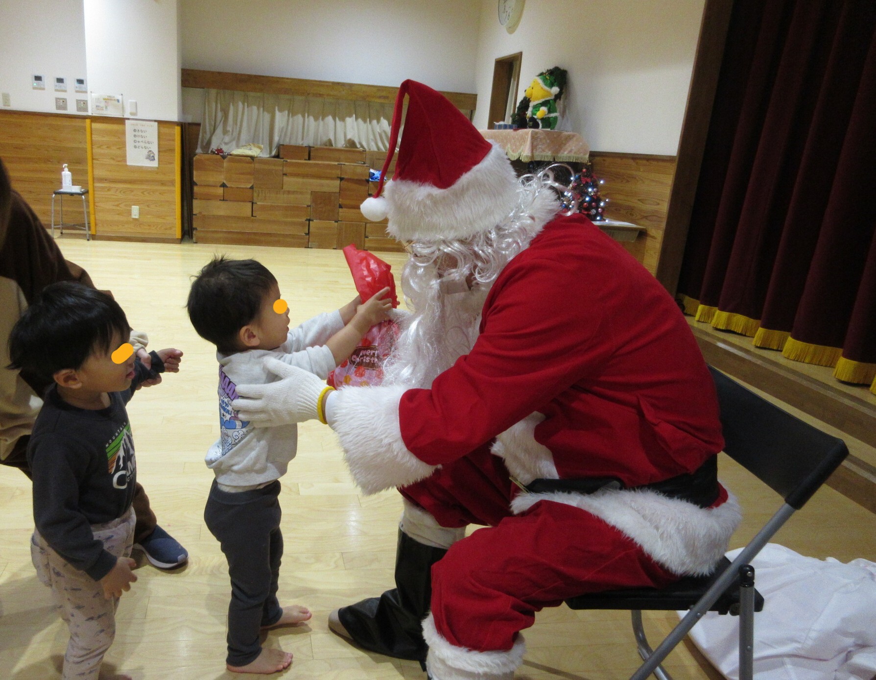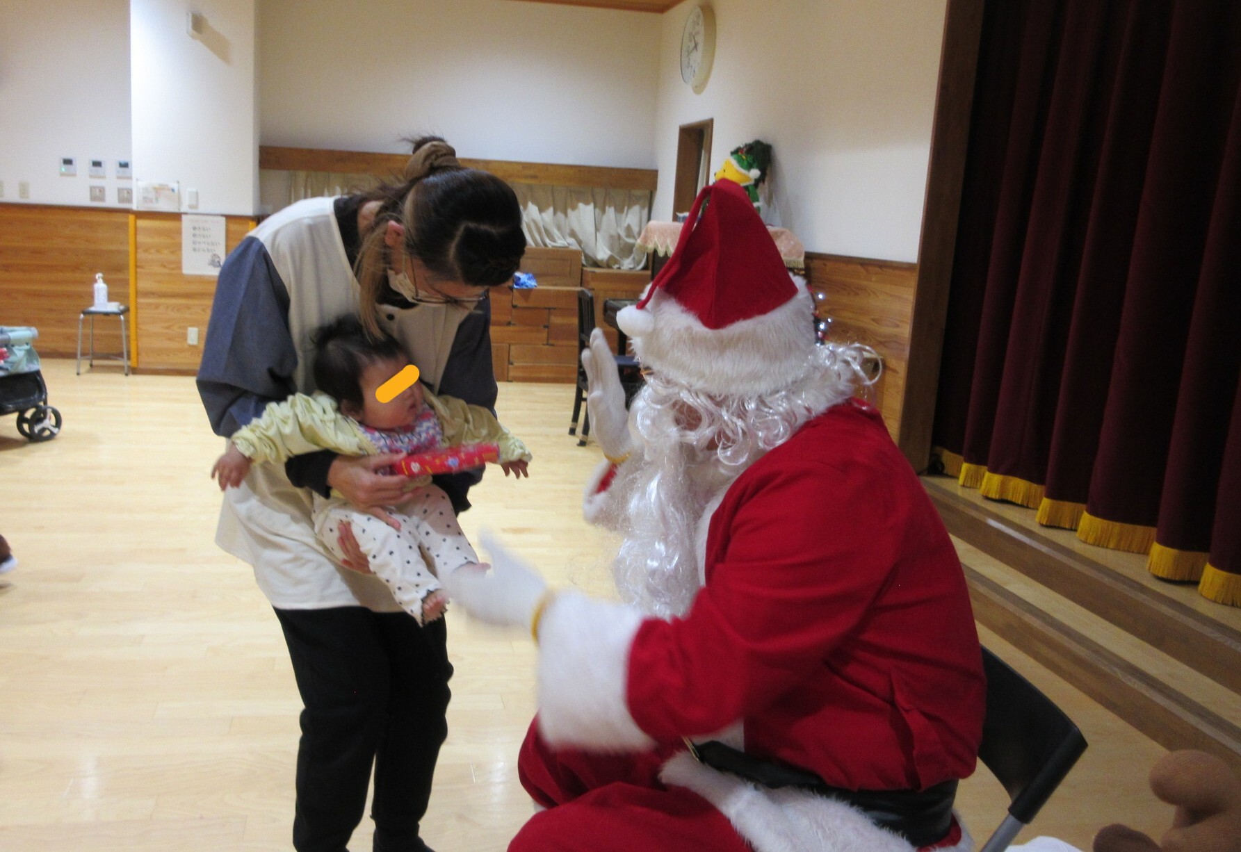 保育所のお友達も泣かずにサンタさんの手にタッチ。