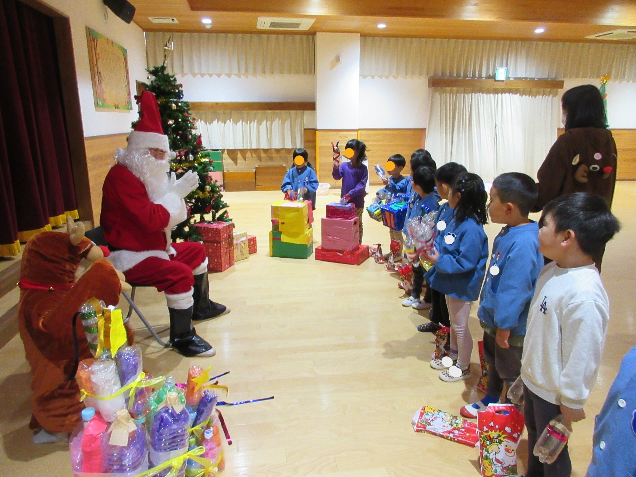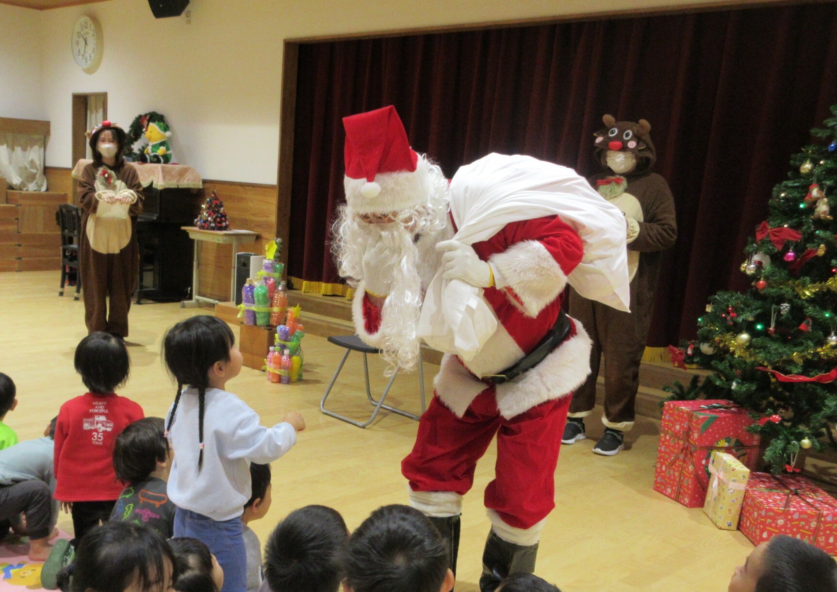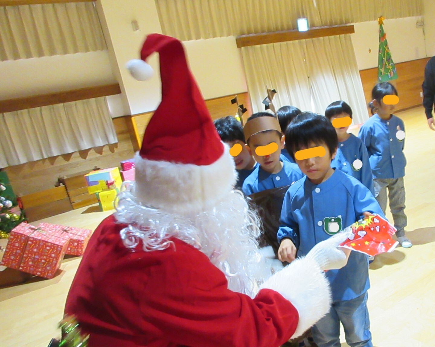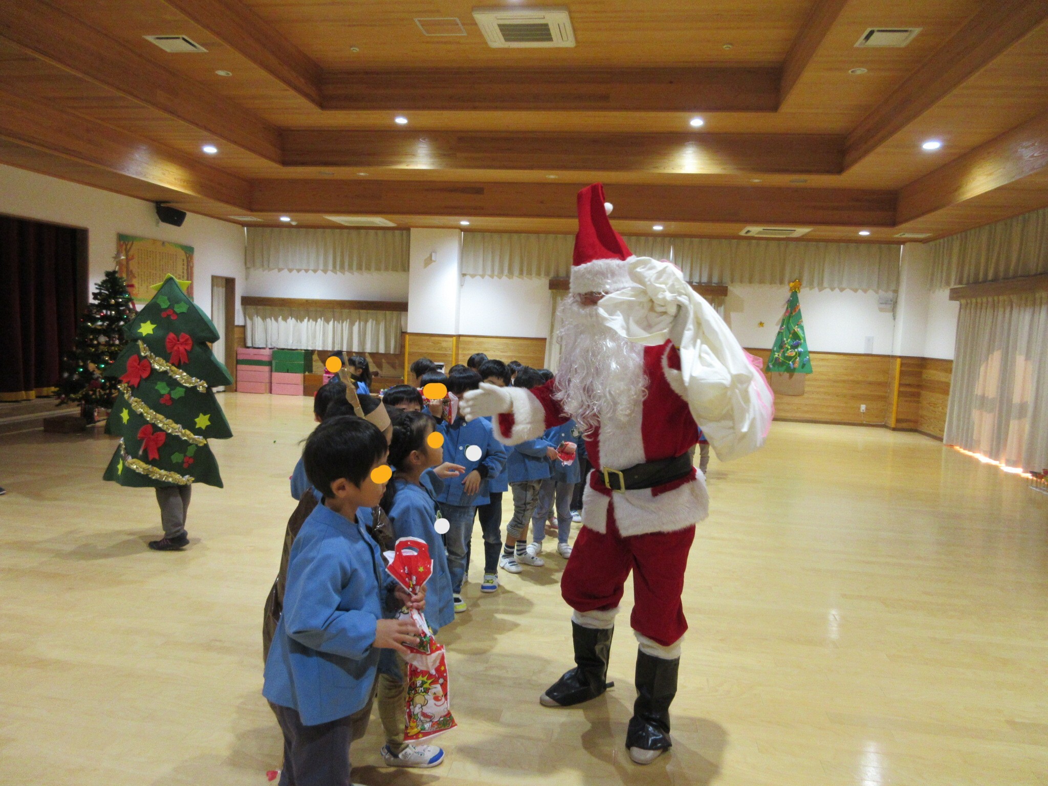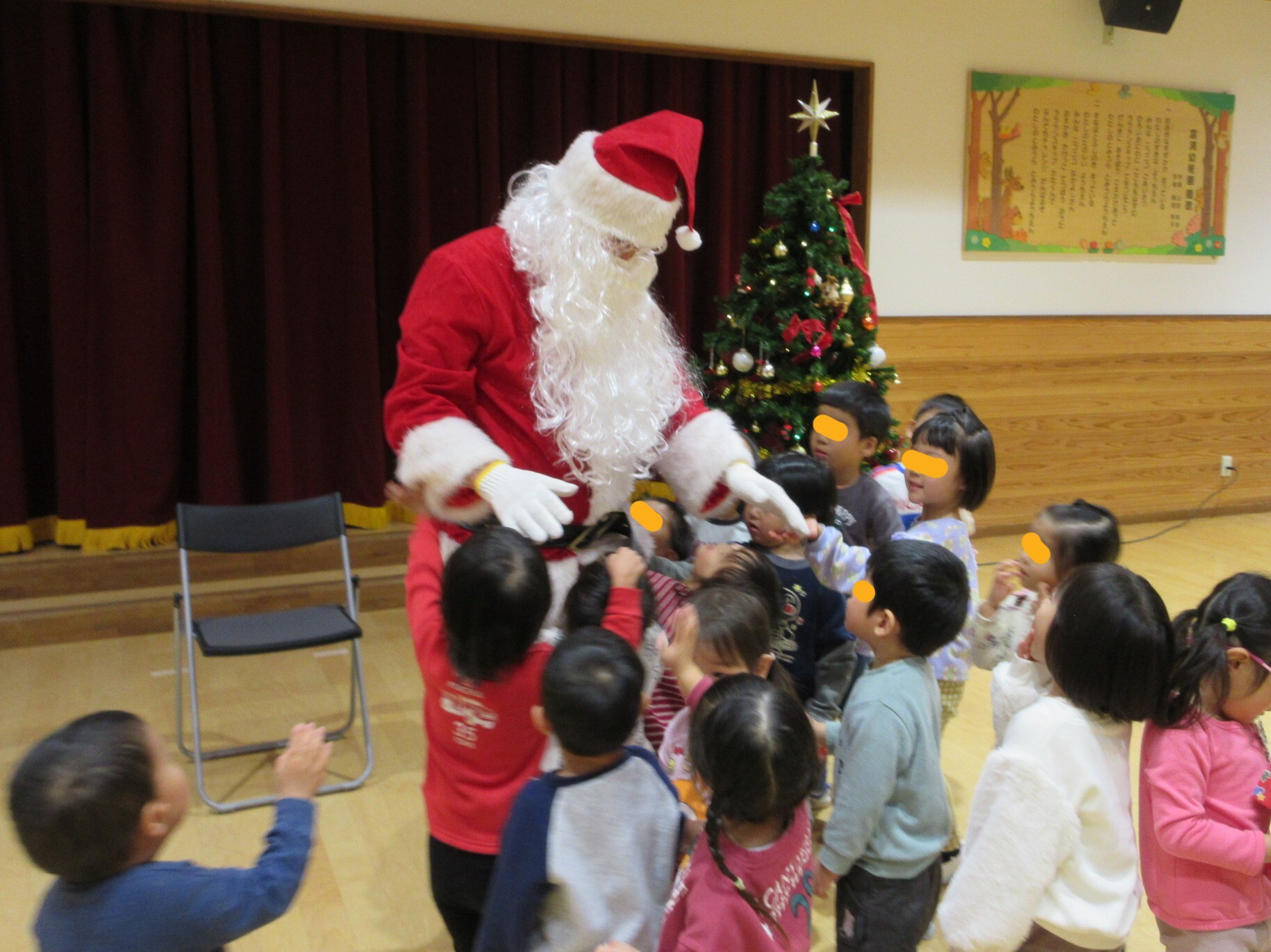 保育所のお友達も泣かずにサンタさんの手にタッチ。