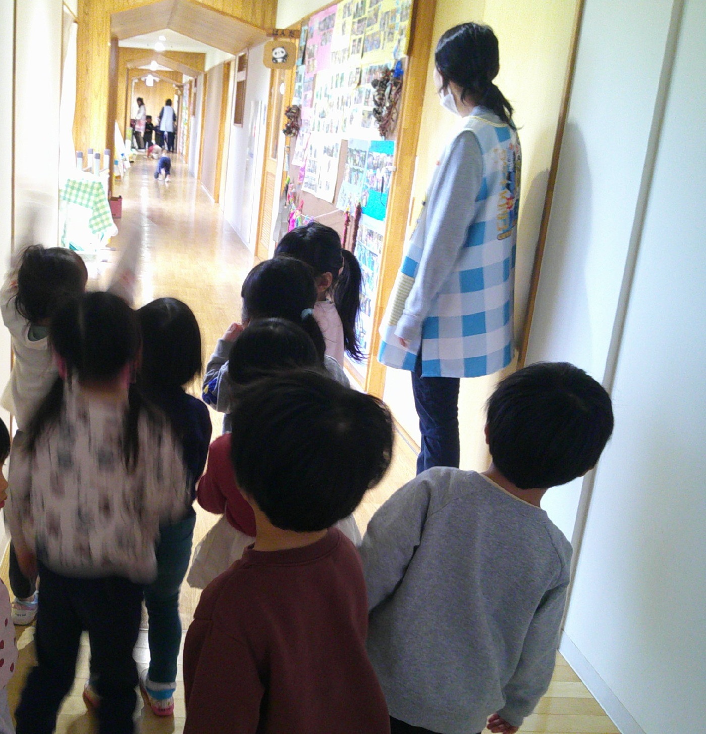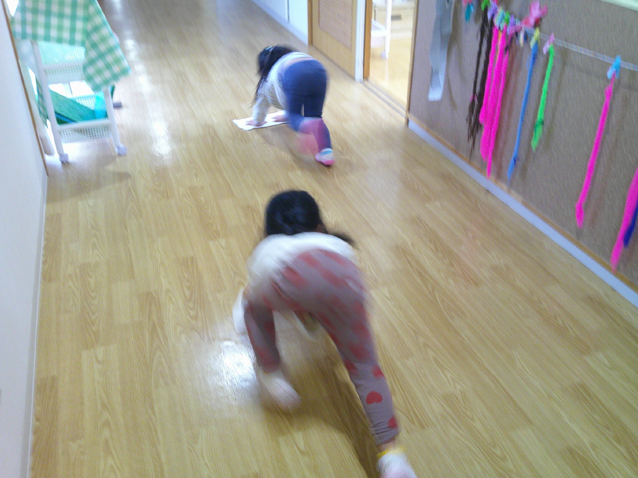 ぱんださんは 廊下の雑巾かけリレーで